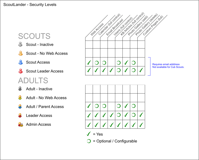 ScoutLander makes it easy to set the permissions for your users. To view a diagram of the security levels available to your users Click Here.